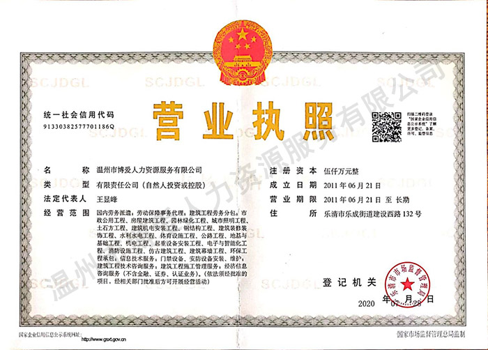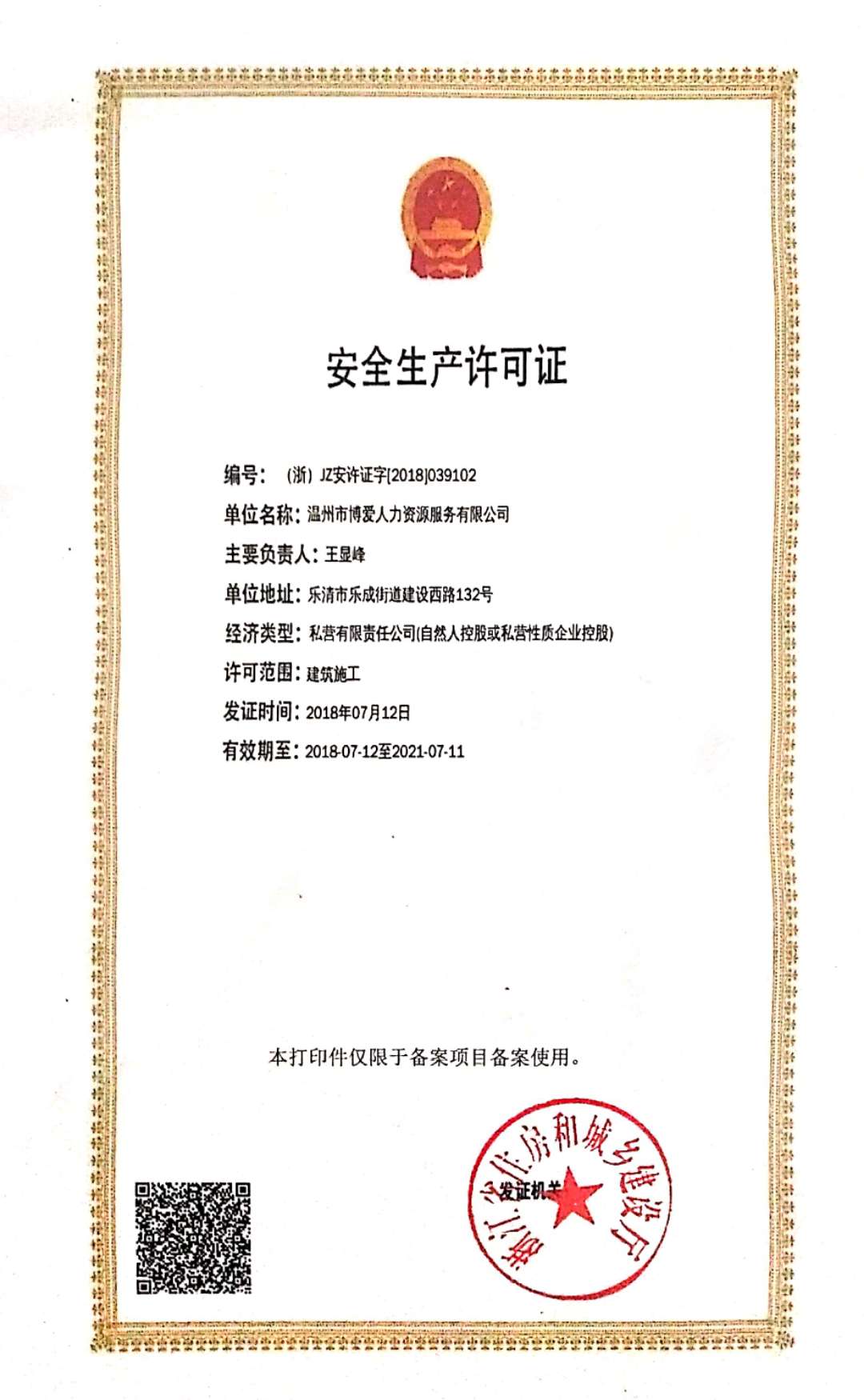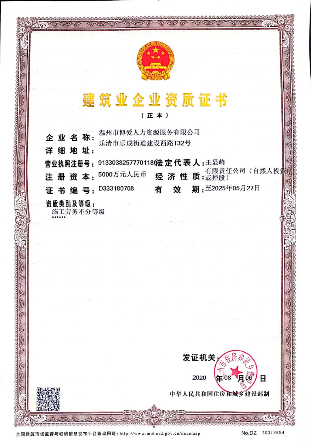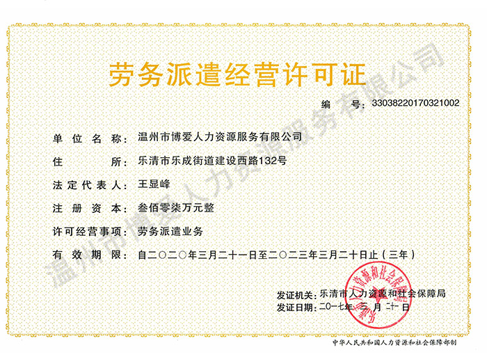 温州市博爱人力资源服务公司于2011年6月21日经乐清市工商行政部门登记成立。2014年1月14日浙江省住房和城乡建设厅颁发(浙)JZ安许证字(2013)030736《安全生产许可证》;2014年3月19日乐清市人力资源和社会保障局批准《劳务派遣经营许可证》。并且,与温州市博爱特卫保安服务有限公司并肩拼搏市场,温州市博爱人力资源服务公司具备承接国内劳务派遣、国内建筑工程劳务作业分包业务、建筑工程施工管理服务、劳务保障事务代理和物业管理等业务,已经形成为客户一条龙服务的经营体系。