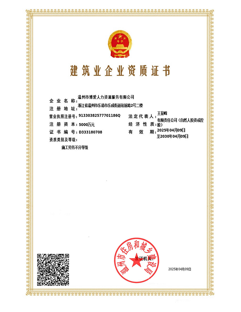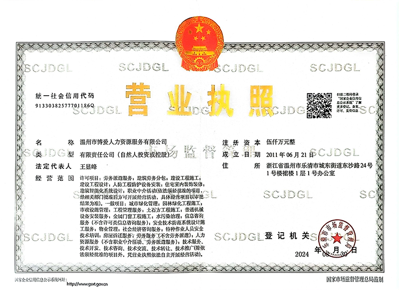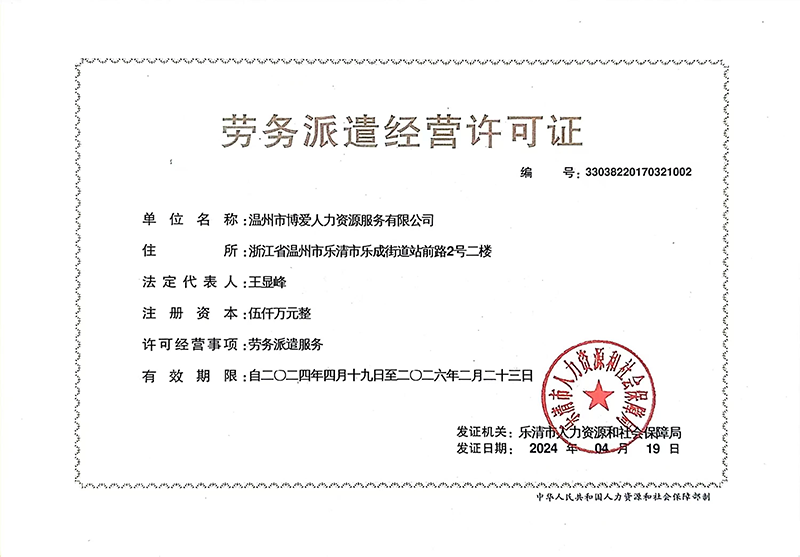 温州市博爱人力资源服务公司于2011年6月21日经乐清市工商行政部门登记成立。2014年1月14日浙江省住房和城乡建设厅颁发(浙)JZ安许证字(2013)030736《安全生产许可证》;2014年3月19日乐清市人力资源和社会保障局批准《劳务派遣经营许可证》。并且,与温州市博爱特卫保安服务有限公司并肩拼搏市场,温州市博爱人力资源服务公司具备承接国内劳务派遣、国内建筑工程劳务作业分包业务、建筑工程施工管理服务、劳务保障事务代理和物业管理等业务,已经形成为客户一条龙服务的经营体系。